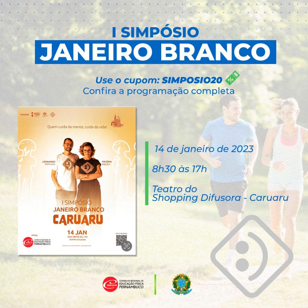 No dia 14 de janeiro, CREF12/PE apoia a Campanha e convida a todos a participarem do 1° Simpósio Janeiro Branco: ‘Quem cuida da mente, cuida da vida! ’, no Teatro do Shopping Difusora, em Caruaru com a participação dos idealizadores do Janeiro Branco, os psicólogos Leonardo Abrahão e Valéria Ribeiro.