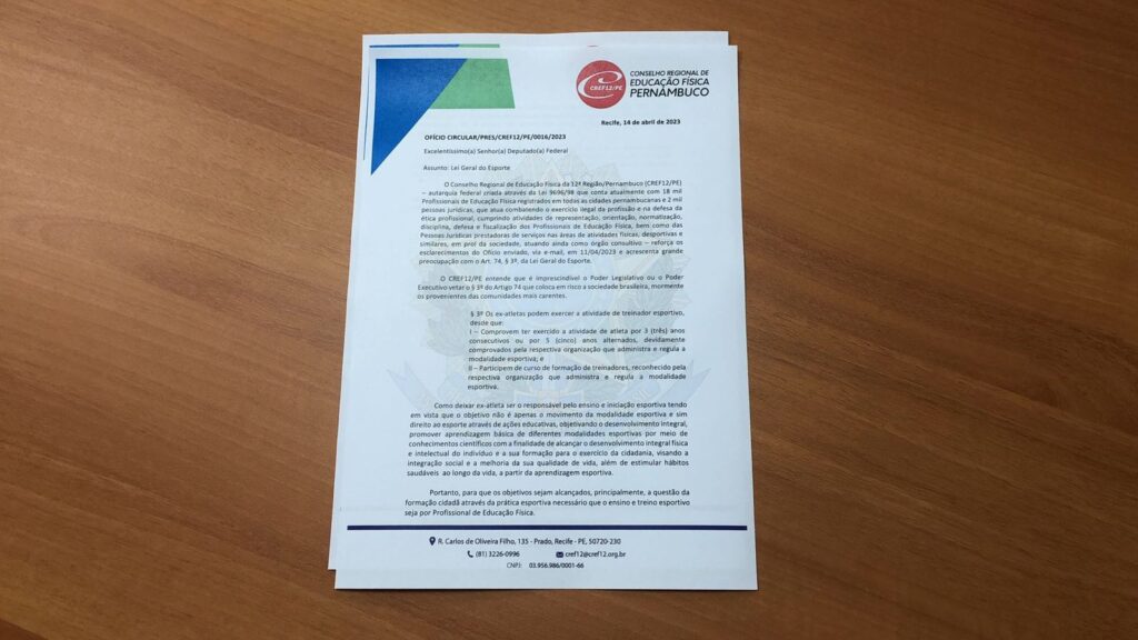 O Conselho Regional de Educação Física da 12ª Região/Pernambuco (CREF12/PE) – autarquia federal criada através da Lei 9696/98 que conta atualmente com 18 mil Profissionais de Educação Física registrados em todas as cidades pernambucanas e 2 mil pessoas jurídicas, que atua combatendo o exercício ilegal da profissão e na defesa da ética profissional, cumprindo atividades de representação, orientação, normatização, disciplina, defesa e fiscalização dos Profissionais de Educação Física, bem como das Pessoas Jurídicas prestadoras de serviços nas áreas de atividades físicas, desportivas e similares, em prol da sociedade, atuando ainda como órgão consultivo – enviou Ofício a todos os Deputados Federais e Senadores por Pernambuco mostrando grande preocupação com o Art. 74, § 3º, da Lei Geral do Esporte.
