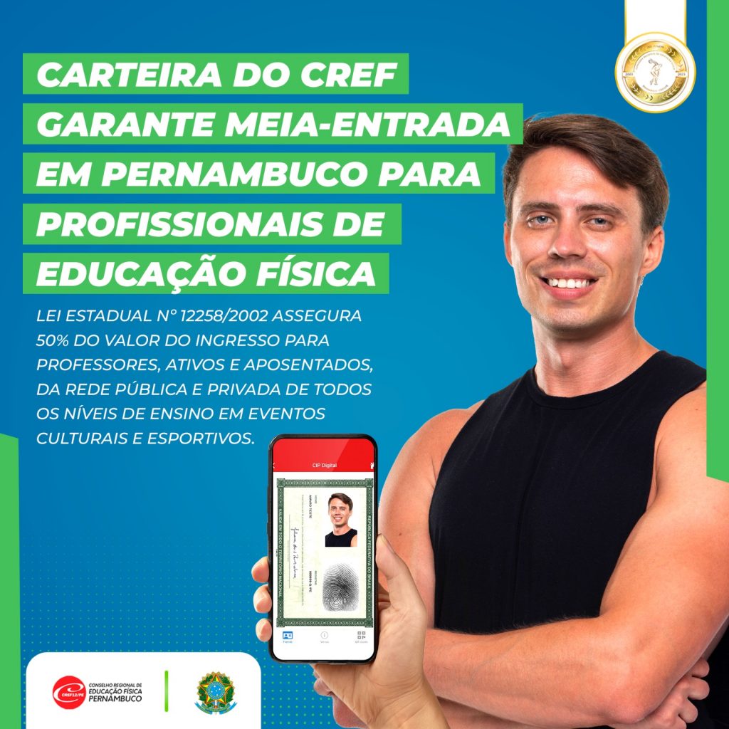 Pernambuco é o 1º estado do país a garantir esse direito aos bacharéis em educação física. O CREF12/PE já oficiou os cinemas do estado para o cumprimento da Lei. Lembramos que a Lei não se aplica apenas aos cinemas. Todos os eventos culturais, de lazer, entretenimento e esportivos no estado de Pernambuco devem garantir meia-entrada mediante apresentação da Carteira de Identidade Profissional (CIP) do Conselho Regional de Educação Física (CREF).