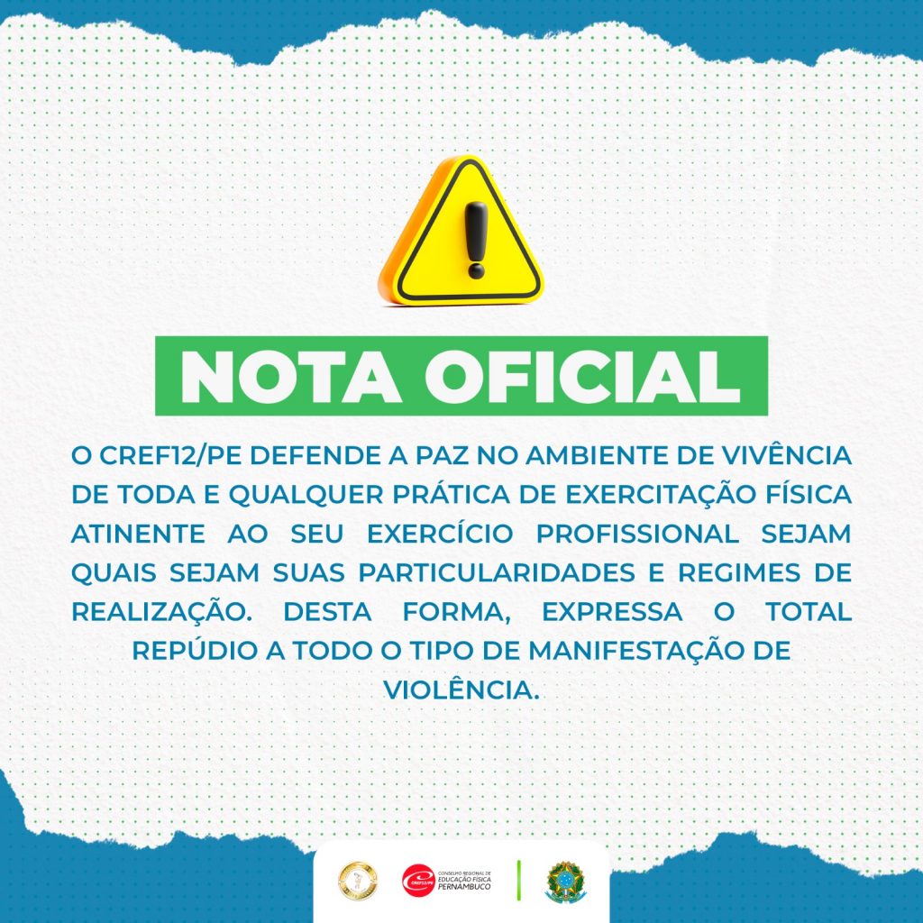 O CREF12/PE defende o diálogo e a paz no ambiente de vivência de toda e qualquer prática de exercitação física atinente ao seu exercício profissional sejam quais sejam suas particularidades e regimes de realização. Desta forma, expressa o total repúdio a todo o tipo de manifestação de violência.