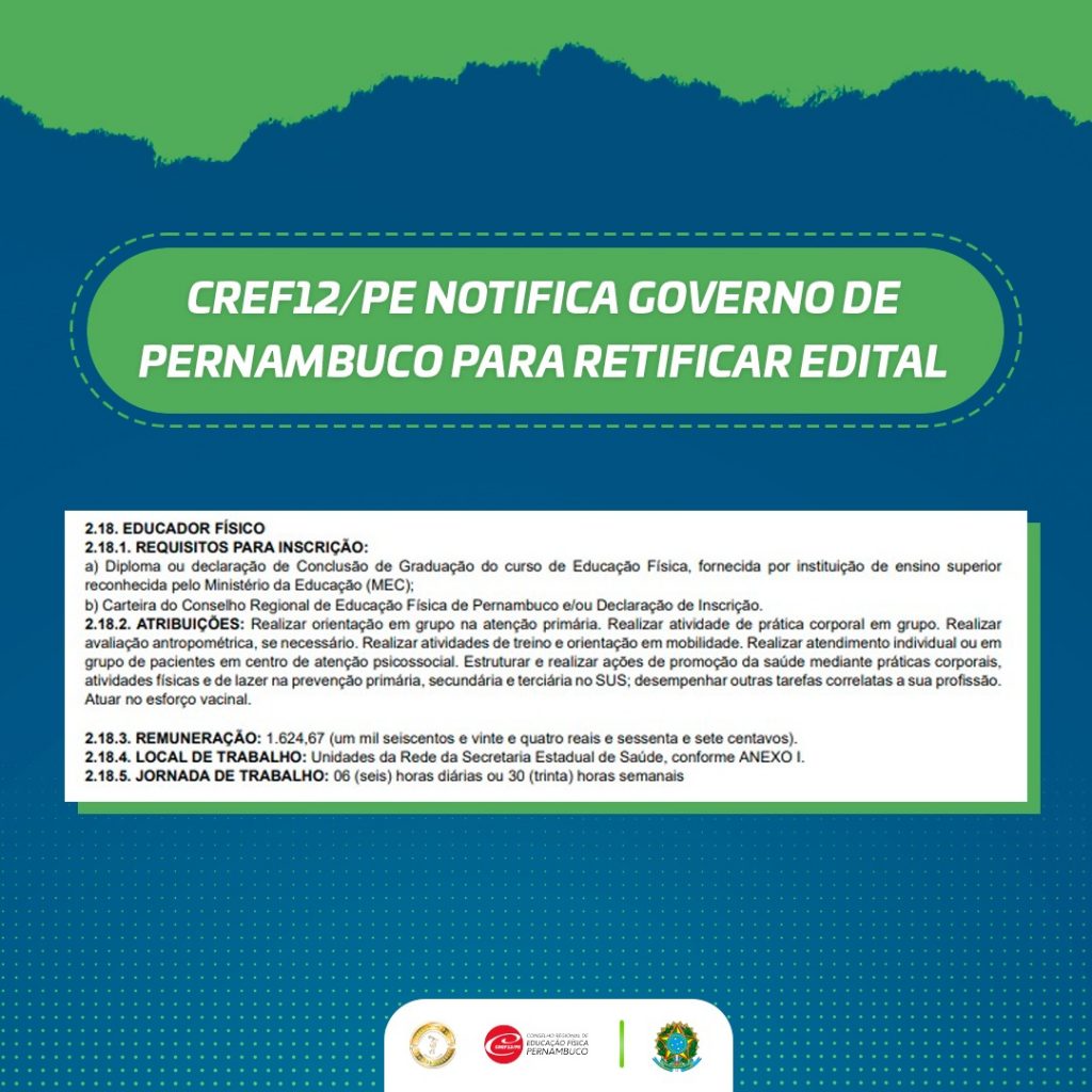 O Conselho Regional de Educação Física da 12ª Região/Pernambuco (CREF12/PE) enviou ofício ao Governo de Pernambuco para retificação do edital da Seleção Pública Simplificada para a contratação temporária de profissionais de saúde.
