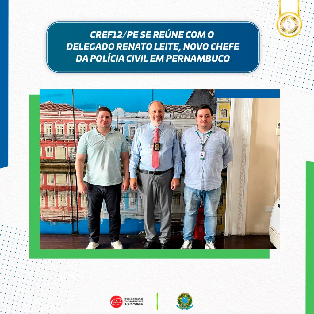O Prof. Lúcio Beltrão (CREF 003574-G/PE), presidente do Conselho Regional de Educação Física da 12ª Região/Pernambuco (CREF12/PE) e o Assessor Parlamentar do CREF12/PE, Marcelo Caldas se reuniram com o Delegado Renato Leite, novo Chefe da Polícia Civil em Pernambuco, na sede da Polícia Civil de Pernambuco, no Recife/PE.