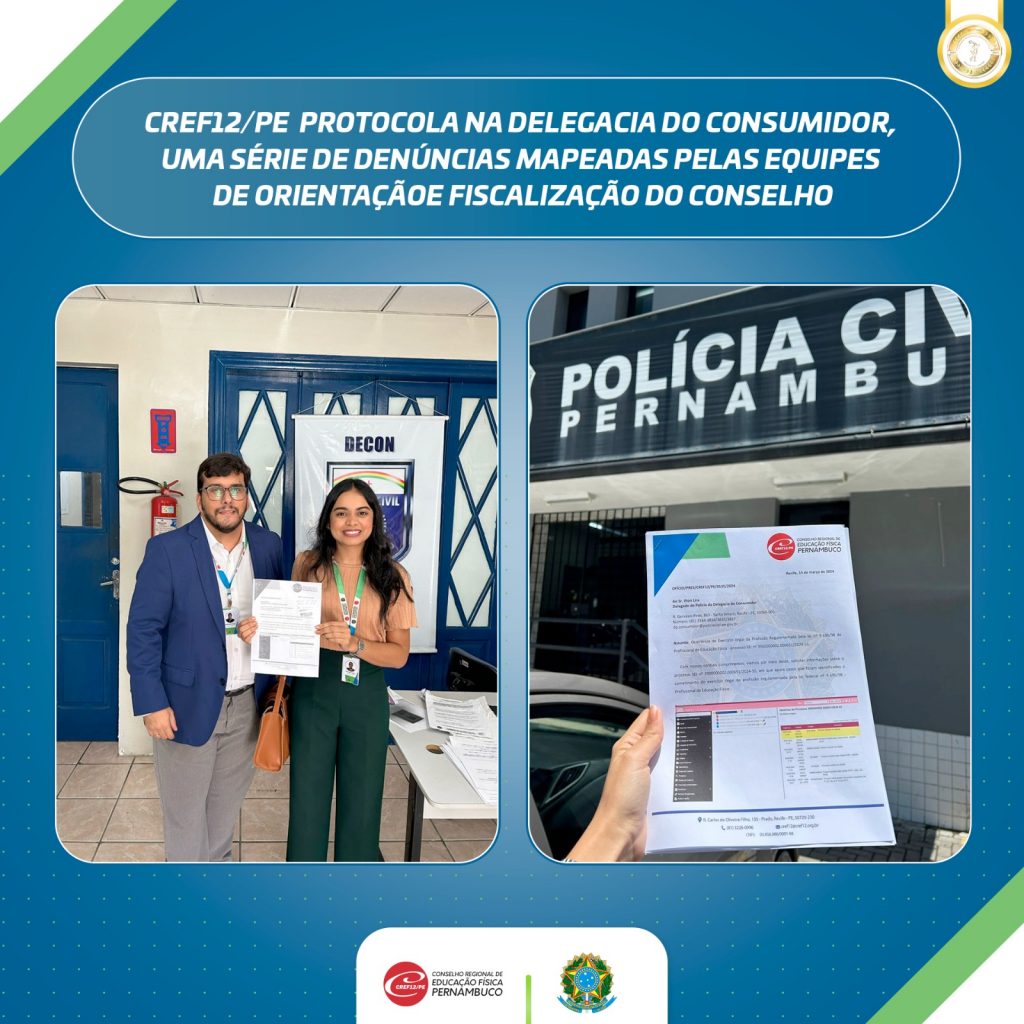 O Conselho Regional de Educação Física da 12ª Região/Pernambuco (CREF12/PE), através dos advogados Dr. Guilherme Otaviano (OAB/PE 46591) e Dra. Gracielle Farias (OAB/PE 43778), protocolou na Delegacia do Consumidor (DECON), uma série de denúncias mapeadas pelas equipes de Orientação e Fiscalização do Conselho, além das denúncias já protocoladas pelo setor jurídico do CREF12/PE, como notícia crime por exercício ilegal da profissão junto à Polícia Civil e ao Ministério Público de Pernambuco.