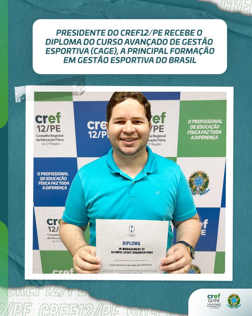 O Prof. Lúcio Beltrão (CREF 003574-G/PE), Presidente do Conselho Regional de Educação Física da 12ª Região/Pernambuco (CREF12/PE), recebeu o Diploma do Curso Avançado de Gestão Esportiva (CAGE), a principal formação em gestão esportiva do Brasil.