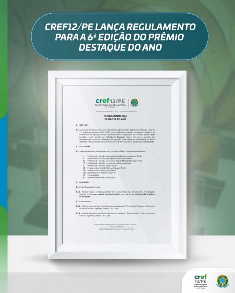 A 6ª Edição do Prêmio Destaque do Ano, realizado pelo Conselho Regional de Educação Física da 12ª Região/Pernambuco (CREF12/PE), que homenageia Profissionais da Educação Física e Pessoas Jurídicas regulares junto ao CREF12/PE, já está com inscrições abertas. 🥇🥈🥉🎖